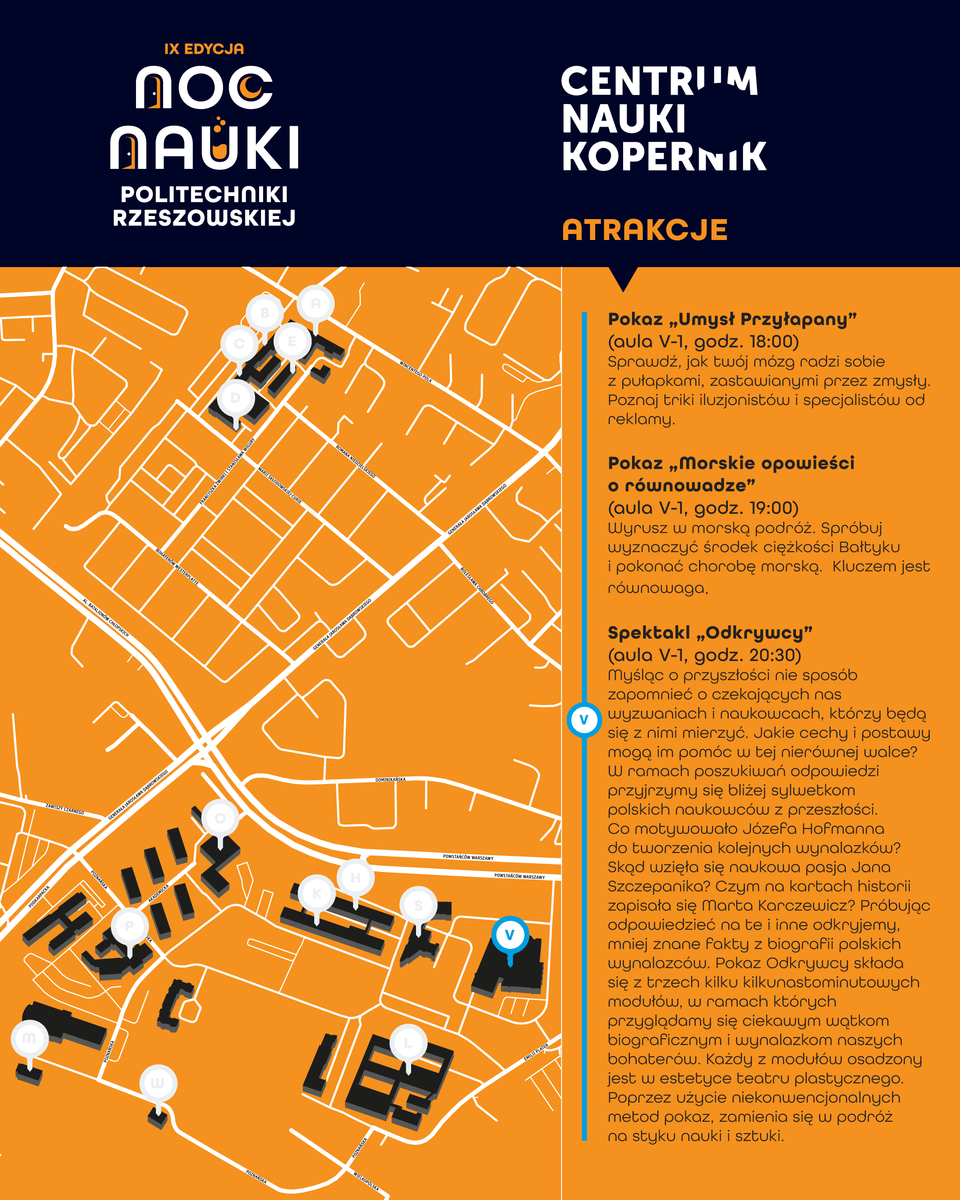 Myśląc o przyszłości nie sposób zapomnieć o czekających nas wyzwaniach i naukowcach, którzy będą się z nimi mierzyć. Jakie cechy i postawy mogą im pomóc w tej nierównej walce? W ramach poszukiwań odpowiedzi przyjrzymy się bliżej sylwetkom polskich naukowców z przeszłości. Co motywowało Józefa Hofmanna do tworzenia kolejnych wynalazków? Skąd wzięła się naukowa pasja Jana Szczepanika? Czym na kartach historii zapisała się Marta Karczewicz? Próbując odpowiedzieć na te i inne odkryjemy, mniej znane fakty z biografii polskich wynalazców. Pokaz Odkrywcy składa się z trzech kilku kilkunastominutowych modułów, w ramach których przyglądamy się ciekawym wątkom biograficznym i wynalazkom naszych bohaterów. Każdy z modułów osadzony jest w estetyce teatru plastycznego. Poprzez użycie niekonwencjonalnych metod pokaz, zamienia się w podróż na styku nauki i sztuki.